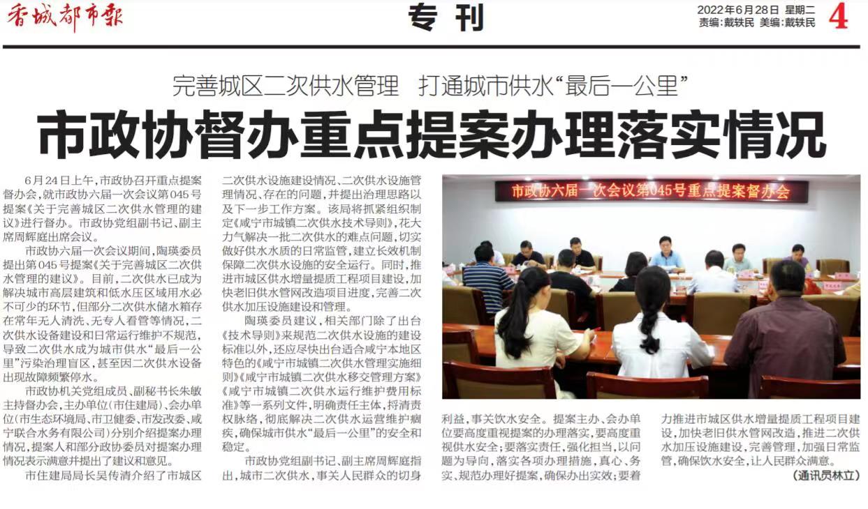 6月24日上午,市政協(xié)召開重點提案督辦會,就市政協(xié)六屆一次會議第045號提案《關(guān)于完善城區(qū)二次供水管理的建議》進行督辦。市政協(xié)黨組副書記、副主席周輝庭出席會議。