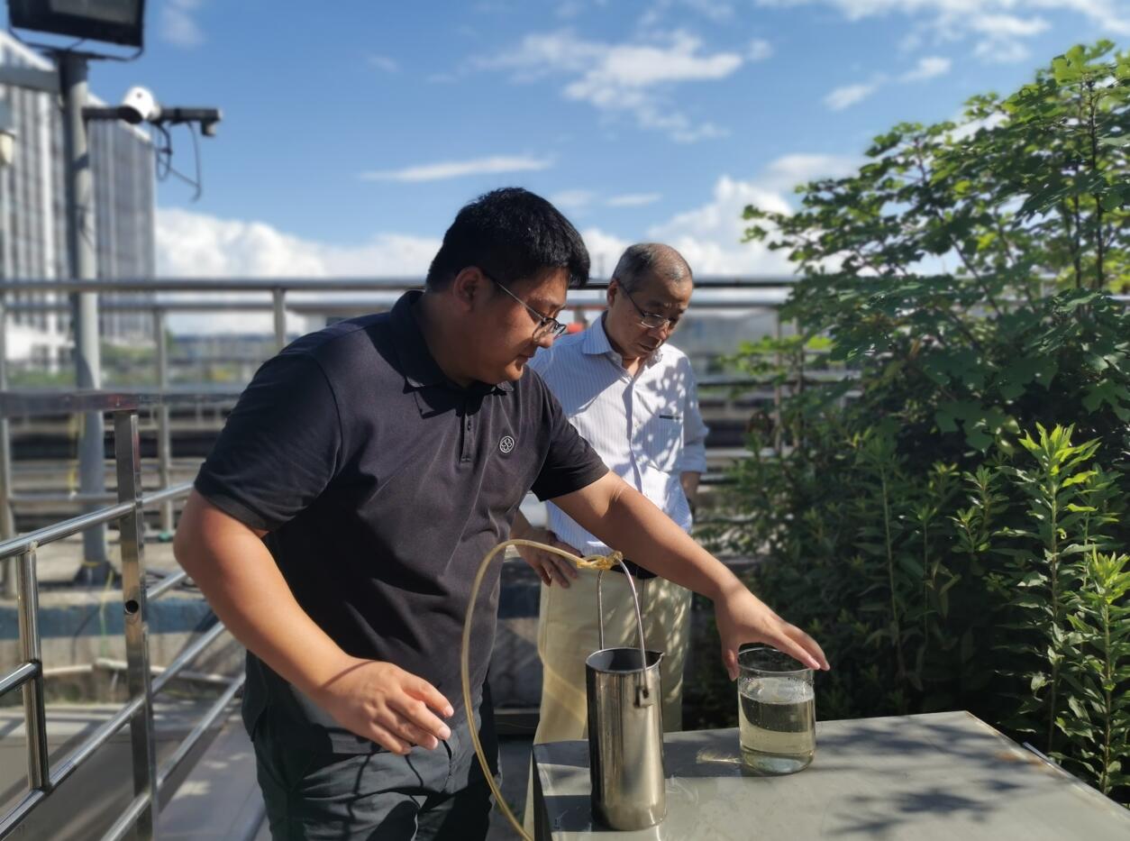 圖:俞總在污水排放口查看出廠水質(zhì)