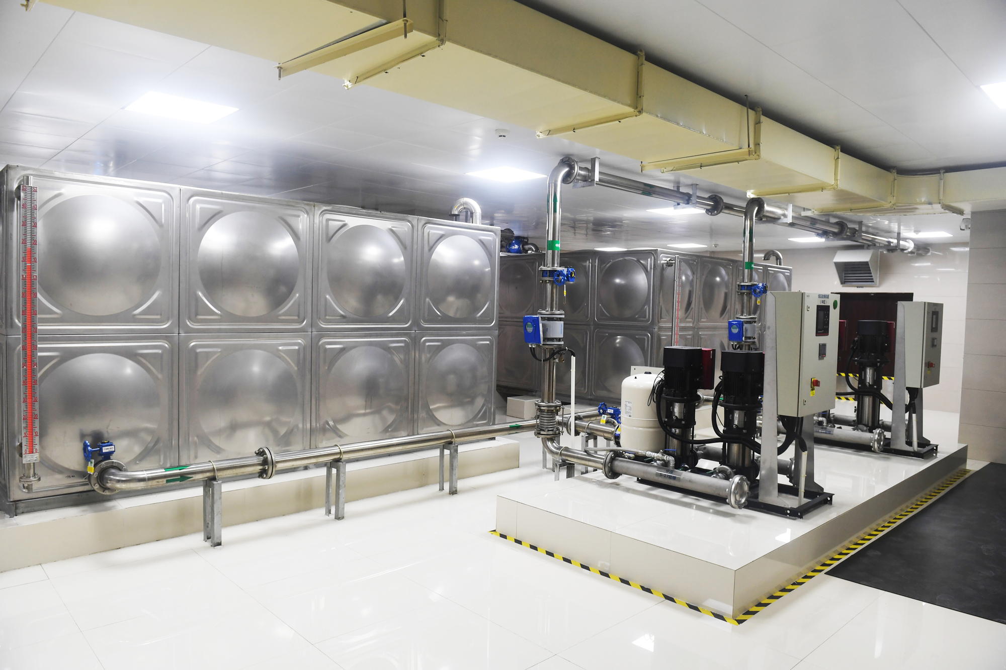 圖:咸寧聯(lián)合水務(wù)二次供水標(biāo)準(zhǔn)化泵房 泵房?jī)?nèi)兩個(gè)32立方米和64立方米超大水箱互為備用、交替供水,當(dāng)一個(gè)水箱清洗消毒時(shí),另一個(gè)水箱可持續(xù)供水,水箱旁的兩臺(tái)紫外線消毒裝置每小時(shí)可對(duì)120立方米水進(jìn)行消毒處理,配合實(shí)時(shí)在線水質(zhì)偵測(cè)系統(tǒng),如發(fā)現(xiàn)水質(zhì)指標(biāo)接近限值前,向中控平臺(tái)發(fā)出水質(zhì)預(yù)報(bào)警,提醒工作人員及時(shí)處理,從而保障居民飲水安全。 二次供水標(biāo)準(zhǔn)化泵房如何管理? 為有效保障城市二次供水安全,咸寧聯(lián)合水務(wù)有限公司對(duì)內(nèi)制定了嚴(yán)格的規(guī)章制度,公司從事二次供水衛(wèi)生管理和清潔維修人員必須進(jìn)行健康體檢,取得健康證明后方可上崗工作。另外,每次清洗水箱后,二次供水的水樣都會(huì)委托專業(yè)檢測(cè)機(jī)構(gòu)——咸寧市香泉水質(zhì)檢測(cè)有限公司(已取得省級(jí)CMA資質(zhì)認(rèn)定證書)對(duì)水質(zhì)進(jìn)行檢測(cè),在24小時(shí)后出具水質(zhì)檢測(cè)報(bào)告遞送給小區(qū)物業(yè)進(jìn)行公布,自覺接受廣大居民朋友的監(jiān)督。