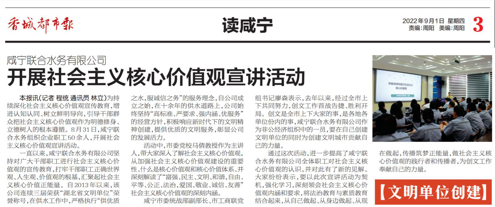 圖∶《香城都市報》刊登相關(guān)新聞 為進(jìn)一步推進(jìn)社會主義核心價值觀宣傳工作,提高公司職工精神文明素質(zhì)。8月31日,咸寧聯(lián)合水務(wù)有限公司與中共咸寧市委宣傳部、咸寧市工商聯(lián)共同開展“社會主義核心價值觀宣講”活動。此次活動由市委黨校馬倩老師主講,咸寧市委統(tǒng)戰(zhàn)部副部長、市工商聯(lián)黨組書記廖森、咸寧聯(lián)合水務(wù)有限公司總經(jīng)理毛雄輝等領(lǐng)導(dǎo)出席本次宣講活動。