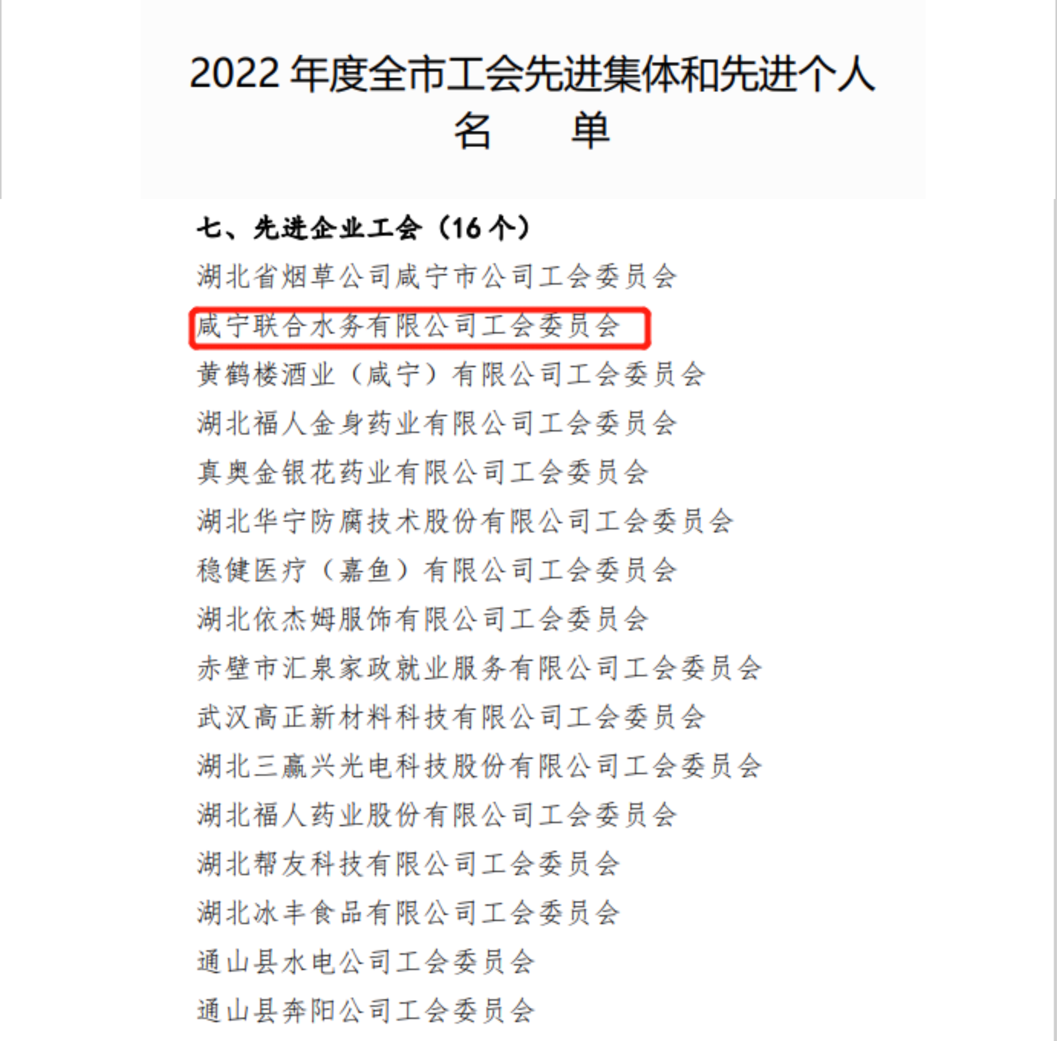 | 咸寧聯(lián)合水務(wù)榮獲“2022年度全市工會(huì)先進(jìn)集體”榮譽(yù)稱號(hào) | ||