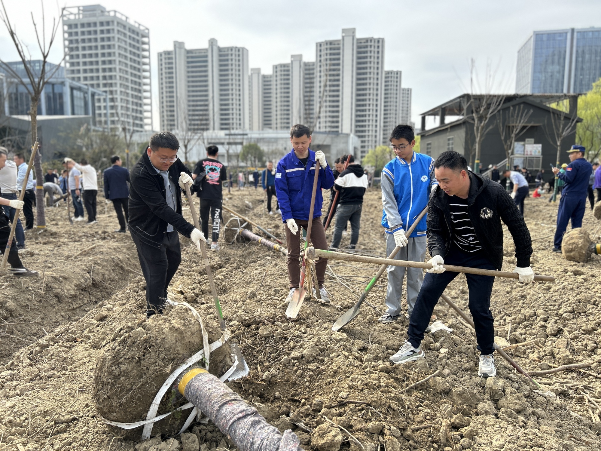 在植樹現(xiàn)場,公司志愿者們按事先分工,揮鍬鏟土、扶苗培土、拎桶澆水……所有人分工協(xié)作、配合默契,現(xiàn)場呈現(xiàn)出一派熱火朝天的勞動(dòng)景象。經(jīng)過現(xiàn)場全體人員的辛勤努力,300余株櫸樹苗木迎風(fēng)挺立,為區(qū)街增添綠意和生機(jī)。