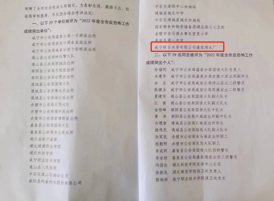近年來,咸寧聯(lián)合水務堅決貫徹落實市委市政府和市反恐怖工作領導小組的決策部署,積極履行供水安全反恐職責。能獲此殊榮,也體現(xiàn)了咸寧市反恐怖工作領導小組辦公室對咸寧聯(lián)合水務潘家灣水廠2022年度反恐怖工作的充分認可。