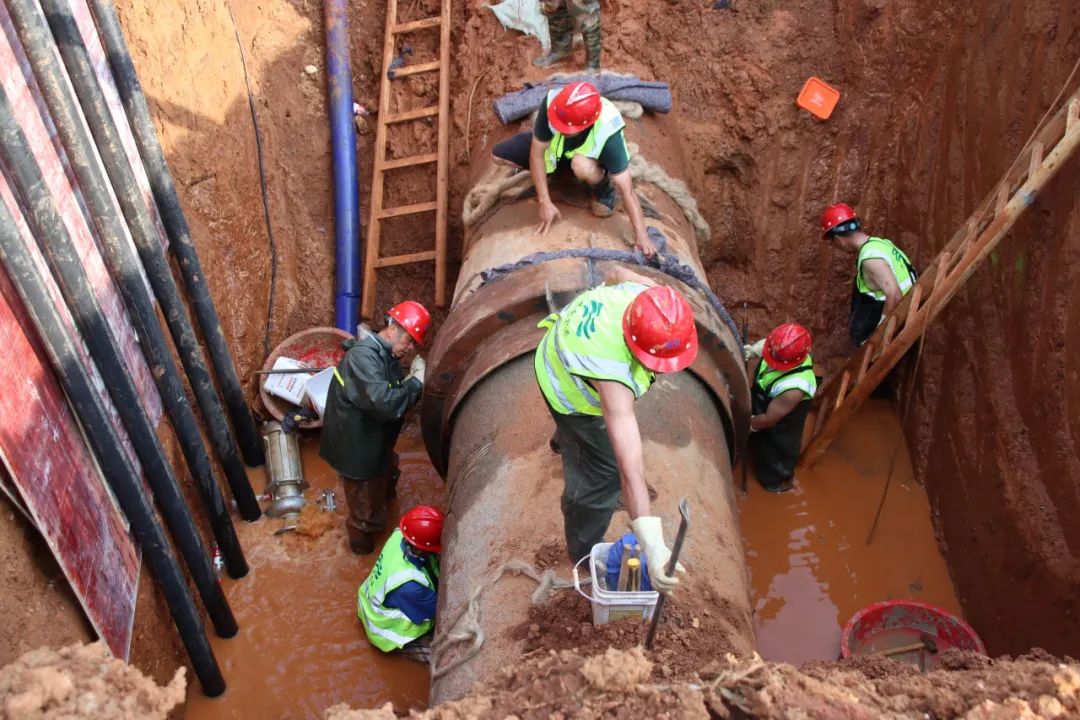 無懼“高”溫,做好應(yīng)急搶修 夏季作為一年之中的用水高峰期,季節(jié)的特殊性使得管道爆管、漏水現(xiàn)象發(fā)生頻率較高,供水管道搶修量比其他時(shí)間段明顯增加。7月12日,通江大道大屋吳附近DN1200mm供水管網(wǎng)因老化發(fā)生漏水,咸寧聯(lián)合水務(wù)多部門聯(lián)動(dòng)火速趕赴現(xiàn)場了解情況,并迅速啟動(dòng)應(yīng)急搶修預(yù)案,第一時(shí)間緊急調(diào)配挖掘機(jī)、發(fā)電車、抽水機(jī)等大型搶修機(jī)具進(jìn)行增援,安排應(yīng)急搶修專班趕往事發(fā)現(xiàn)場,迅速開展現(xiàn)場勘察、確定漏點(diǎn)具體情況、設(shè)立全面安全防護(hù)措施等搶修前期工作。在搶修期間,面對(duì)管徑大、時(shí)間緊、施工作業(yè)環(huán)境復(fù)雜等諸多難題,搶修人員齊心配合、攻堅(jiān)克難,井然有序地開展漏點(diǎn)測定、降水開挖、焊接維修、沖洗試壓等一系列搶修和恢復(fù)工作,天氣炎熱,施工人員早已汗流浹背,但他們不畏艱難酷暑,堅(jiān)守崗位,歷經(jīng)三十六個(gè)小時(shí)的晝夜奮戰(zhàn),完美完成DN1200主管道的維修和保養(yǎng),未對(duì)城區(qū)供水造成任何不良影響。