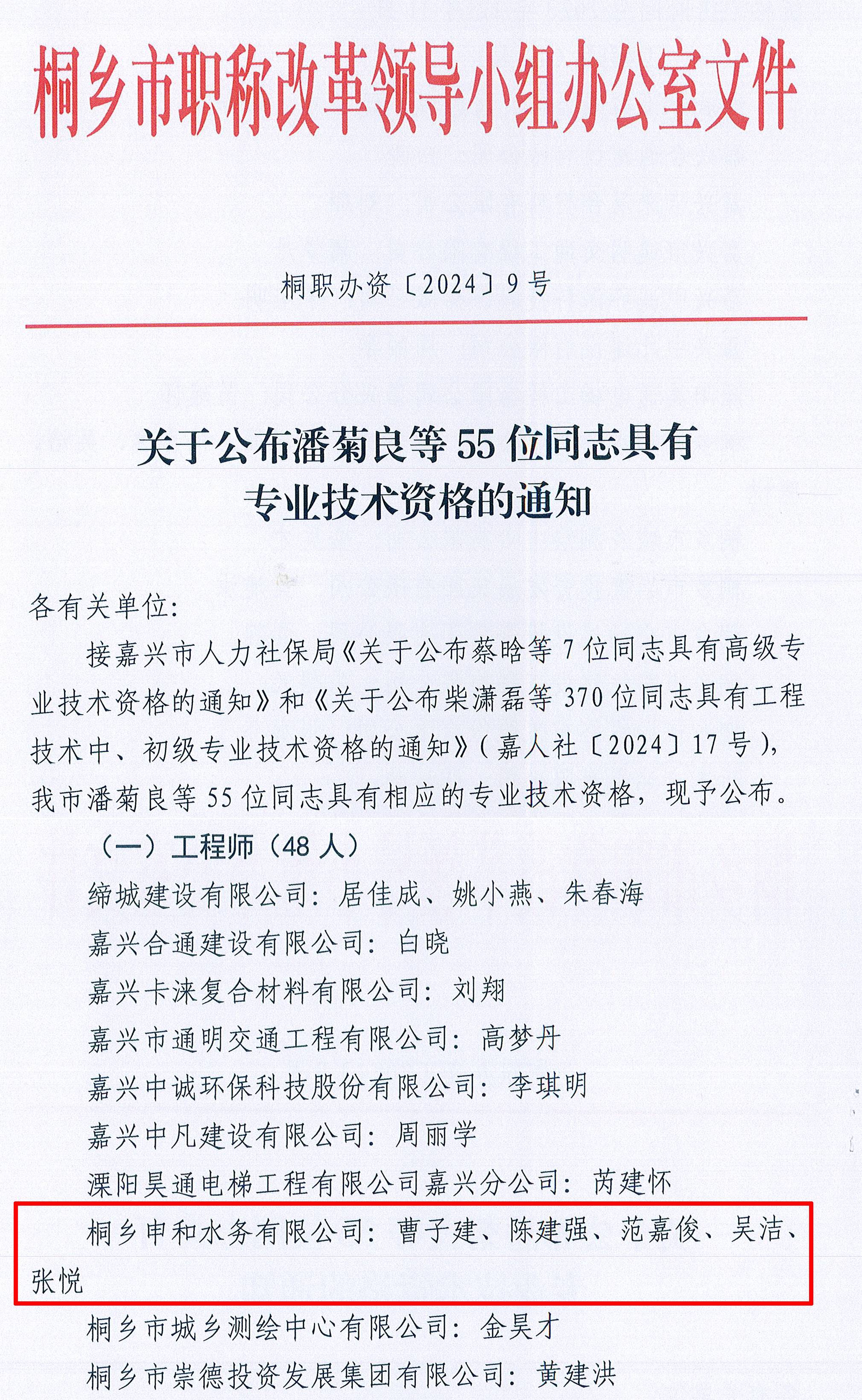 近日,桐鄉(xiāng)申和水務有限公司曹子建、陳建強、范嘉俊、吳潔、張悅5名員工一同順利通過嘉興市工程技術中級專業(yè)技術資格評審委員會評審及認定,成功獲得生態(tài)環(huán)境監(jiān)測與分析專業(yè)中級工程師職稱。