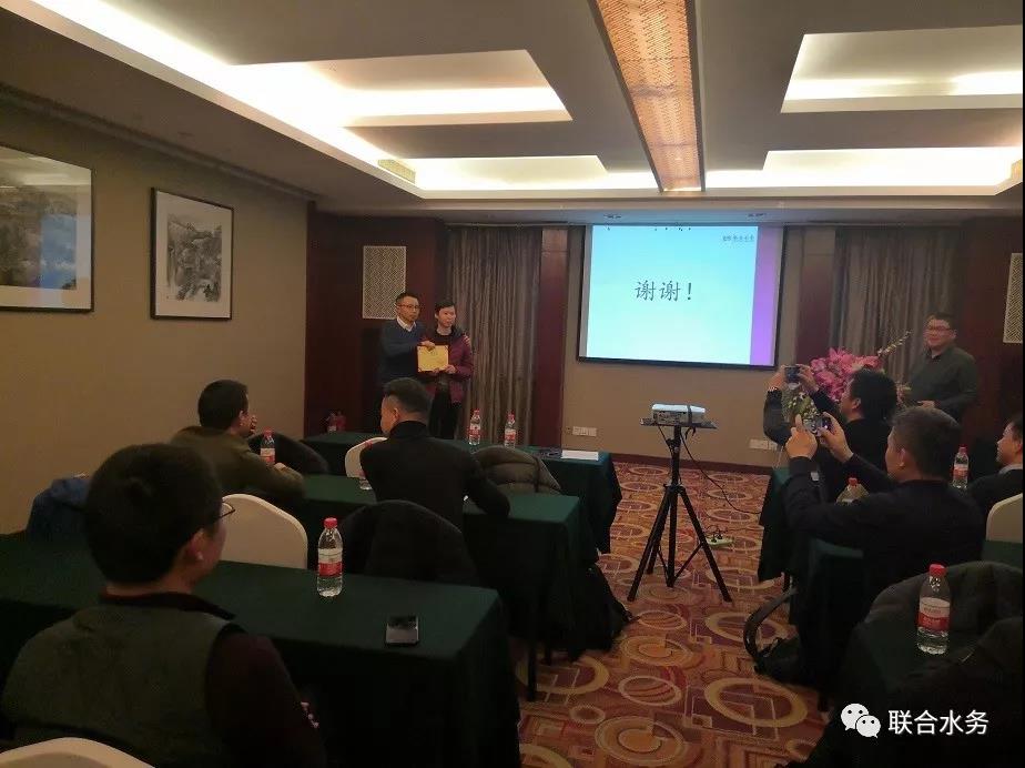 圖3:聯(lián)合水務(wù)集團(tuán)高級副總裁陳樵先生為老員工頒獎 總部來的4位領(lǐng)導(dǎo)依次發(fā)言,最后陳總就此次會議作了總結(jié)發(fā)言。首先陳總表揚了各部門主管的發(fā)言,肯定了各部門的辛勤付出,陳總感謝大家為公司所作的貢獻(xiàn),也指出了2019年的不足之處。陳總希望大家在2020年一起努力,做好安全生產(chǎn)、達(dá)標(biāo)穩(wěn)定運行、水量水費能更好地完成預(yù)算,對申和水務(wù)2020年的發(fā)展給予了更高的期望。陳總還為大家送上新年賀詞,祝大家新年快樂!萬事如意!闔家歡樂!