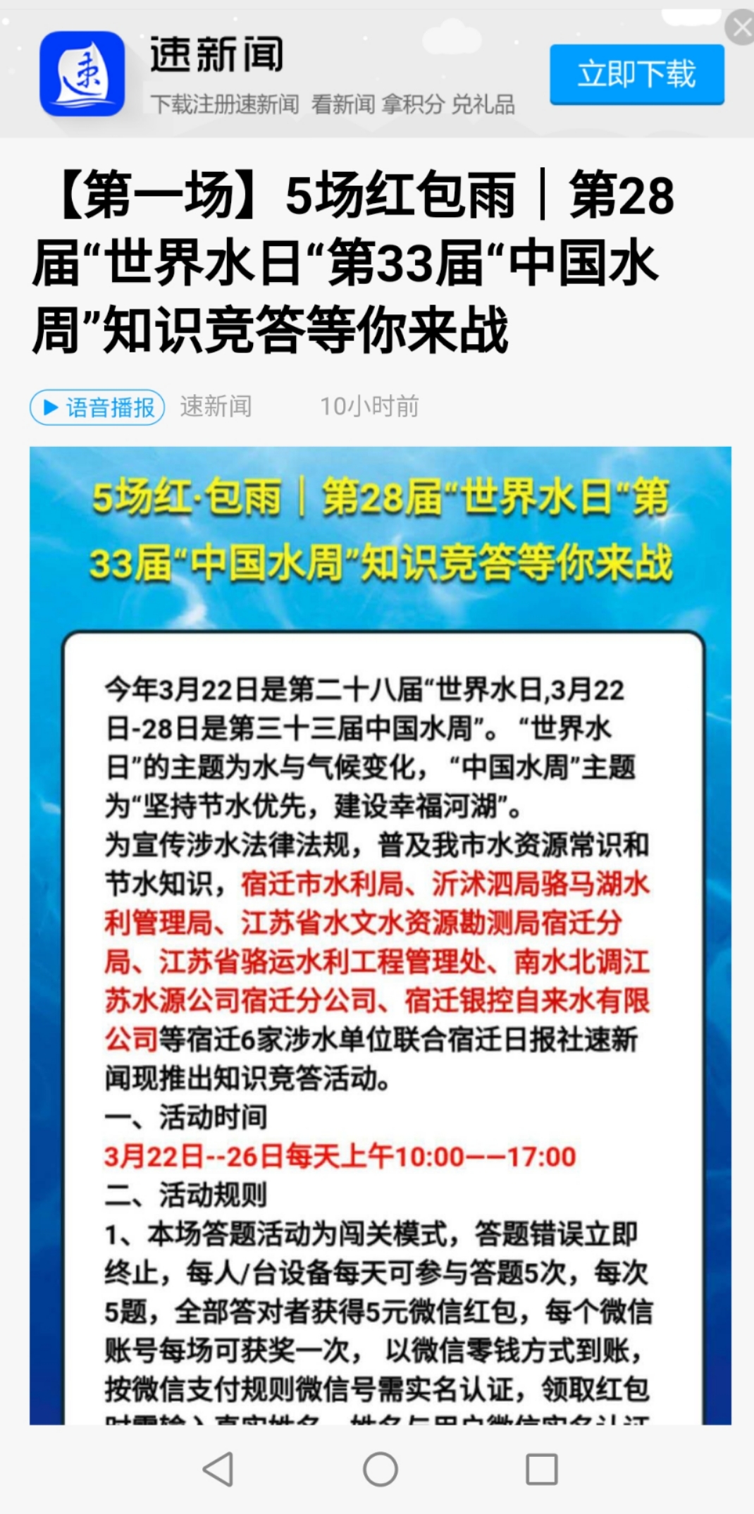 “汴水流,泗水流,流到瓜州古渡頭”。位于蘇北泗水畔的酒都宿遷以洋河美酒聞名大江南北乃至全世界。水是酒的命脈,好酒必有好水。宿遷,別稱“水城”,地處淮河、沂沭泗流域中下游,南臨洪澤湖,北接駱馬湖,著名的京杭大運河穿境而過。在3月22日“世界水日“、3月22日—28日 “中國水周”到來之機,聯(lián)合水務宿遷銀控自來水有限公司會同宿遷市水利局、沂沭泗局駱馬湖水利管理局、江蘇省水文水資源勘測局宿遷分局、南水北調(diào)江蘇水源公司宿遷分公司及宿遷日報社共同舉辦系列宣傳活動,護衛(wèi)城市命脈,傳承生態(tài)愿景。一方水土養(yǎng)一方人, 節(jié)水、護水、愛水,全員行動起來,讓水韻宿遷更加大放光彩。 受疫情影響,今年宿遷市的“世界水日”、“中國水周”宣傳活動采用線上方式扎實開展,方式新穎且力度不減。經(jīng)過前期合辦單位的用心籌劃,圍繞今年國家水利部確定的“堅持節(jié)水優(yōu)先 建設幸福河湖”的宣傳主題,系列宣傳活動以別開生面、匠心獨具的六大方式精彩呈現(xiàn),提高全市人民節(jié)水、護水、愛水意識,形成全員參與、共創(chuàng)水生態(tài)美好家園的良好氛圍。 全民總動員開始啦!網(wǎng)絡倡議書簽名轉發(fā)活動,倡議書內(nèi)容豐富,既有宿遷市水資源知識,還有節(jié)水小竅門呢,以百姓喜聞樂見的微信群、通過微信群、微信朋友圈方式進行轉發(fā);網(wǎng)絡答題贏紅包活動,5場“紅包雨”,第28屆“世界水日”、第33屆“中國水周”知識全民競技,寓教于樂;意見建議征集活動,保護水資源,你獻計,他獻策,水更清、城更美,民更樂;網(wǎng)上攝影展活動,用鏡頭拍下最美水景,感受水鄉(xiāng)靈韻;水美文章征文活動,分享《童年的河》,一水一情,讓故鄉(xiāng)的水在心間流淌;彩印卡片+鮮花贈送活動,水法宣傳不見面,投放在銀行、商場、醫(yī)院、公園、公交站臺等公共場所,全民知法、懂法、守法,愛護水源,人人有責。宿遷銀控自來水有限公司動員公司全體員工積極參與各類活動,以實際行動支持節(jié)水、護水、愛水行動。 圖1:節(jié)水倡議書冠名單位