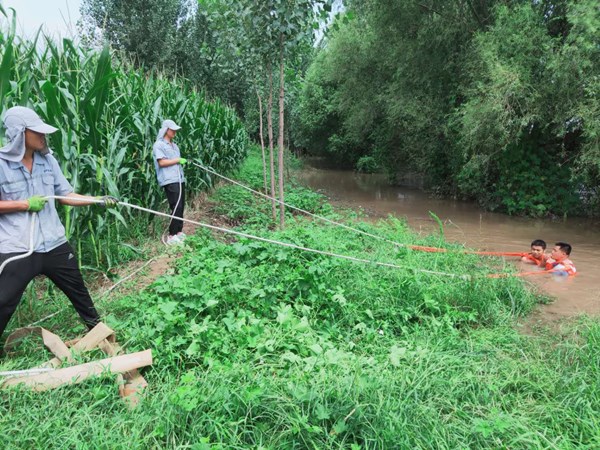 8月19日午時,隨著洪峰的即將到來,污水廠存在河水通過入河排污口倒灌進廠的風險。接到通知后,廠長周磊連午飯都未來得及吃,第一時間報告總經(jīng)理楊坤,一同帶領機電班等人員趕赴現(xiàn)場,爭分奪秒利用盲板和閘門對汾河堤壩南北兩端的入河排污口進行雙重封堵。由于上漲的水位已淹沒南端入河排污口,需要人員下河操作,現(xiàn)場人員紛紛自告奮勇要求下水封堵,最后由水性較好的機電班原文琦和楊樂鵬負責水下作業(yè)。原文琦、楊樂鵬不顧個人安危,做好安全防護后跳入渾濁湍急的河水中,與岸上人員密切配合,經(jīng)過近半個小時的奮戰(zhàn),順利封堵住了入河排污口,解除了汾河水倒灌的危機?吹綕皲蹁跖郎习兜膬扇,雖然滿身泥濘臉上卻掛著勝利的笑容,岸上全體人員終于放下了懸著的心。