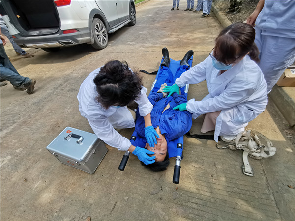 圖2:應(yīng)急演練現(xiàn)場(chǎng)--醫(yī)護(hù)人員查看傷員情況 總指揮迅即趕到事故地點(diǎn)統(tǒng)籌指揮,應(yīng)急小組多措并舉,疏散現(xiàn)場(chǎng)閑雜人員、布置警戒線、通知救援小組展開救護(hù)工作、撥打120急救電話,各項(xiàng)工作緊張而有序開展。救援隊(duì)長(zhǎng)了解事故大致情況后,安排人員在現(xiàn)場(chǎng)安裝大功率通風(fēng)設(shè)備進(jìn)行通風(fēng)處理,并開展初期救援,2分鐘后,公司專業(yè)救援人員佩戴便攜式防毒面具、安全帶,攜帶檢測(cè)儀器、對(duì)講機(jī),連接救生索,入池檢測(cè)氣體濃度,評(píng)估下池救援的可行性。在確認(rèn)可以施救的情況下,將傷員轉(zhuǎn)移至池外通風(fēng)空曠處,隨即按標(biāo)準(zhǔn)心肺復(fù)蘇手法實(shí)施搶救,直至120救護(hù)車趕到。專業(yè)醫(yī)護(hù)人員查看傷員情況后將其轉(zhuǎn)移至救護(hù)車上,送往醫(yī)院搶救治療。至此,經(jīng)過精心策劃、周密安排的應(yīng)急演練圓滿落下帷幕。