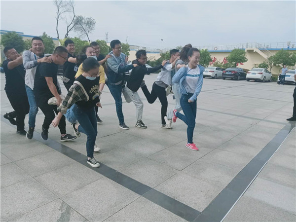 圖1:投飛鏢 “投飛鏢”活動(dòng)結(jié)束,大家意猶未盡,顧不上休息,馬上投入下一個(gè)團(tuán)體項(xiàng)目單腳火車跑:7人排成一列,每人僅用右腳支撐。后一人右手搭前一人肩,左手托住前一人左腳,多隊(duì)并排一起站在起跑線上。裁判發(fā)令后各隊(duì)齊出,賽程為20米,用時(shí)少者為優(yōu)勝隊(duì),每次每個(gè)參賽隊(duì)至少有2名女隊(duì)員參加,比賽過(guò)程中腳掉下來(lái)的隊(duì)伍為犯規(guī),將失去比賽資格。這是一個(gè)考驗(yàn)團(tuán)隊(duì)協(xié)作的項(xiàng)目,大家需步調(diào)一致才能順利快速前行。比賽過(guò)程中,姿態(tài)百出,前仰后合,笑料百出,趣味十足。能順利前行的隊(duì)幾乎沒(méi)有,均困難重重,甚至有幾個(gè)隊(duì)剛一出戰(zhàn)便有人跌倒,不氣餒,顧不上疼痛,迅速爬起來(lái)調(diào)整隊(duì)形再出發(fā)。最終財(cái)務(wù)部組隊(duì)贏得了冠軍。