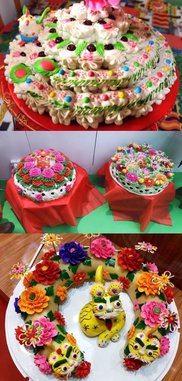古絳州,今天的新絳縣,一直是山西省重要的小麥、棉花產(chǎn)地。麥?zhǔn)諘r(shí)節(jié),家家戶戶收麥、晾曬,用上等的小麥磨成面粉。每逢年歲時(shí)節(jié)、絳州民間面塑形態(tài)各異、花色絢麗,又被當(dāng)?shù)厝朔Q為“花饃”。因民俗而出現(xiàn)的面塑則代代相傳、生生不息,經(jīng)過(guò)幾千年的傳承和經(jīng)營(yíng),成為中國(guó)傳統(tǒng)文化和民間藝術(shù)的一部分。春節(jié),講究“大門(mén)獅子二門(mén)狗”,寓意鎮(zhèn)宅保平安;水缸旁放“雙頭魚(yú)”,寓意連年有余;糧倉(cāng)放牛拉車(chē)和麥囤,寓意糧倉(cāng)滿溢、日子越過(guò)越景氣;天地爺處祭棗山花饃、豬羊饃、節(jié)節(jié)高饃,寓意殺豬宰羊、生活一年比一年好;財(cái)神爺處祭元寶棗籃饃,寓意招財(cái)進(jìn)寶。清明時(shí)節(jié),要捏豬頭饃、刺魚(yú)饃等祭祖掃墓,刺饃還得在墳頭滾一滾,意為已故祖先撓癢癢,盡兒孫之孝。端午節(jié),要捏老虎饃,“虎鎮(zhèn)五毒”,寓意去災(zāi)辟邪。婚禮上,要捏龍鳳糕,插柏葉,紅繩系核桃、紅棗、花生、石榴、寓意夫妻百年好合、發(fā)家致富、生兒育女。新生兒滿月時(shí),要蒸各式各樣的花、果造型的花饃、寓意開(kāi)花結(jié)果。壽誕時(shí)、兒女要為長(zhǎng)輩蒸壽桃饃。為母親拜壽時(shí),插一組“七仙女拜壽”,為父親拜壽時(shí),插一組“八仙慶壽”,顯示兒女孝心。在這片土地上,自漢代以來(lái)流傳千年的捏花饃風(fēng)俗,早已深深融入絳州人們生活的方方面面。只要有誰(shuí)家遇上紅白事,鄰居、親戚都會(huì)聚集在一起幫忙蒸制花饃。