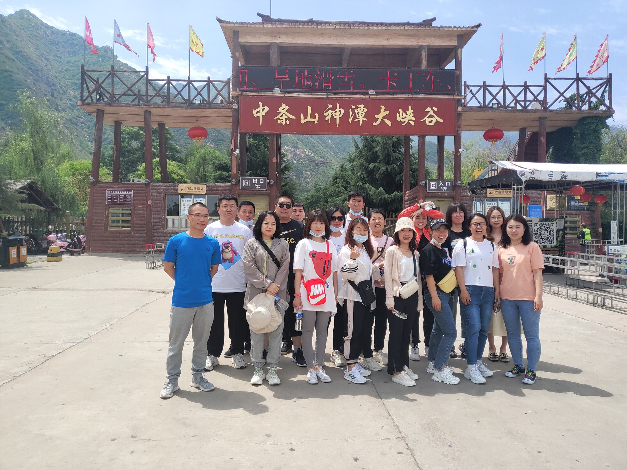 圖:神潭大峽谷合影 進(jìn)入景區(qū)先是水峪口古村,仿古建筑,水車,摩天輪,白鴿,戲臺(tái),古色古香。入口處,集旱地滑雪、大擺錘等刺激性游戲,大伙躍躍欲試,挨個(gè)嘗試,不亦樂乎。 緊接著步入登山環(huán)節(jié),經(jīng)過九九歸一,迎來千年古槐和迎賓瀑布。大家一鼓作氣,繼續(xù)往上攀登。山谷里山勢(shì)巍峨,溪流山泉遍布。萬(wàn)畝天然柏林郁郁蔥蔥,琳瑯密布,山花爛漫。主峰“九洲疙瘩”突兀群山中,云霧天九個(gè)封頂浮于云海之上,亦真亦幻,自古被譽(yù)為“九州太平”。景區(qū)以兩瀑三溪一百零八潭為代表,與千年龜、關(guān)公圣像、關(guān)公試刀臺(tái)、北宋摩崖石刻、夫梯、一線天等景點(diǎn)組成高山峽谷自然景觀。奇峰、怪石、翠海、疊深組合成神妙、奇幻、幽美的自然風(fēng)光,被譽(yù)為“夢(mèng)幻水鄉(xiāng)”“人間仙境”。 賞完這仙境般的峽谷,步入驚險(xiǎn)刺激環(huán)節(jié)。大家三五人結(jié)隊(duì),先后經(jīng)玻璃棧道、空中玻璃吊橋、高空鋼索橋、猿撓古道。 神潭大峽谷的玻璃吊橋,凌空數(shù)百米,腳下的世界一覽無(wú)余,可與張家界玻璃吊橋媲美。如果你足夠膽大,透過玻璃棧道向下垂直俯視試一下,腳下是一片蒼綠,瑰麗的蔥山都被你踩在腳下。 當(dāng)踏上高空鋼索橋,那不規(guī)則的左右晃動(dòng),一失足成千古恨,這句成語(yǔ)在這里就很合適。索道橋在風(fēng)中微微晃動(dòng),仿佛能聽到自己的心跳。隨風(fēng)搖擺!
