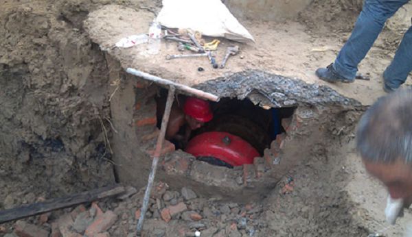(圖12:管網(wǎng)維修人員在狹小的操作坑內(nèi)進(jìn)行管網(wǎng)搶修)
