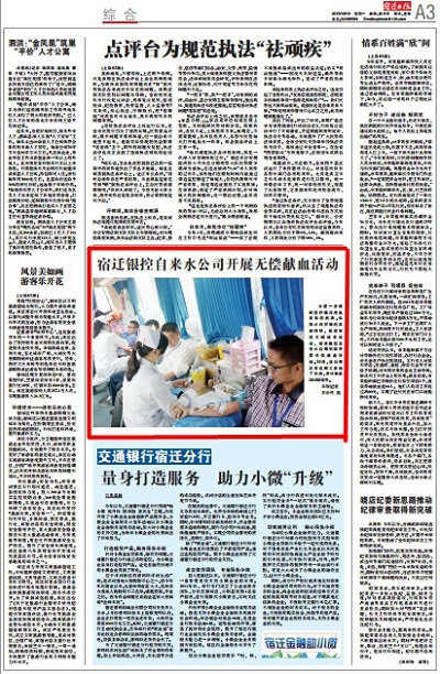 宿遷銀控自來水有限公司弘揚水潤萬物的奉獻(xiàn)精神,多年來,一直堅持積極履行社會責(zé)任,每年均多次組織有意義的公益活動,“無償獻(xiàn)血”作為一項重要的公益事業(yè)已經(jīng)連續(xù)進(jìn)行6年,而且每當(dāng)血庫庫存告急之際我們都會及時伸出援助之手,為打造宿遷文明建設(shè)注入更多力量,也展現(xiàn)展現(xiàn)了我公司熱情、奉獻(xiàn)、和諧的良好企業(yè)形象。
