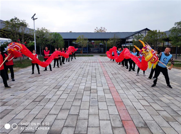圖/ “鼓動(dòng)人心”活動(dòng)現(xiàn)場(chǎng) 最后一個(gè)項(xiàng)目是“龍騰盛世”。所有人齊心協(xié)力將零件組裝成一條活靈活現(xiàn)的龍,并在教練的指導(dǎo)下完成龍騰四海、盤龍?jiān)坪<坝锡垜蛩齻(gè)動(dòng)作。這是一個(gè)大型創(chuàng)作類項(xiàng)目,趣味性和團(tuán)隊(duì)合作性極強(qiáng)。大家各司其職,制作龍骨、畫龍鱗、粘龍頭龍尾,不到一刻鐘的時(shí)間,兩條游龍就制作完成。在舞龍環(huán)節(jié),大家專心聽、用心舞,兩隊(duì)的舞龍動(dòng)作都得到了教練的高度贊揚(yáng)。最后,在教練“風(fēng)水越來越順、生活越來越好”的祝福中結(jié)束了愉快而充實(shí)的團(tuán)建拓展活動(dòng)。